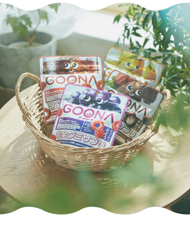 「完全カロリーパフォーマンスⓇ」「完全グミサプリⓇ」「完全チョコサプリⓇ」は、GOONAが独自に開発した、日本で唯一の独占的な登録商標です。類似品には十分ご注意ください。