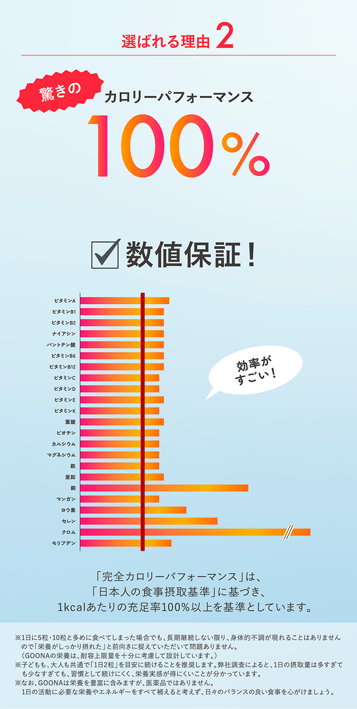 GOONAが定義する「完全カロリーパフォーマンスⓇ」とは、「日本人の食事摂取基準」を参照し、特定の栄養素を、摂取カロリーあたりで100%以上の推奨量を満たしていることを指します。