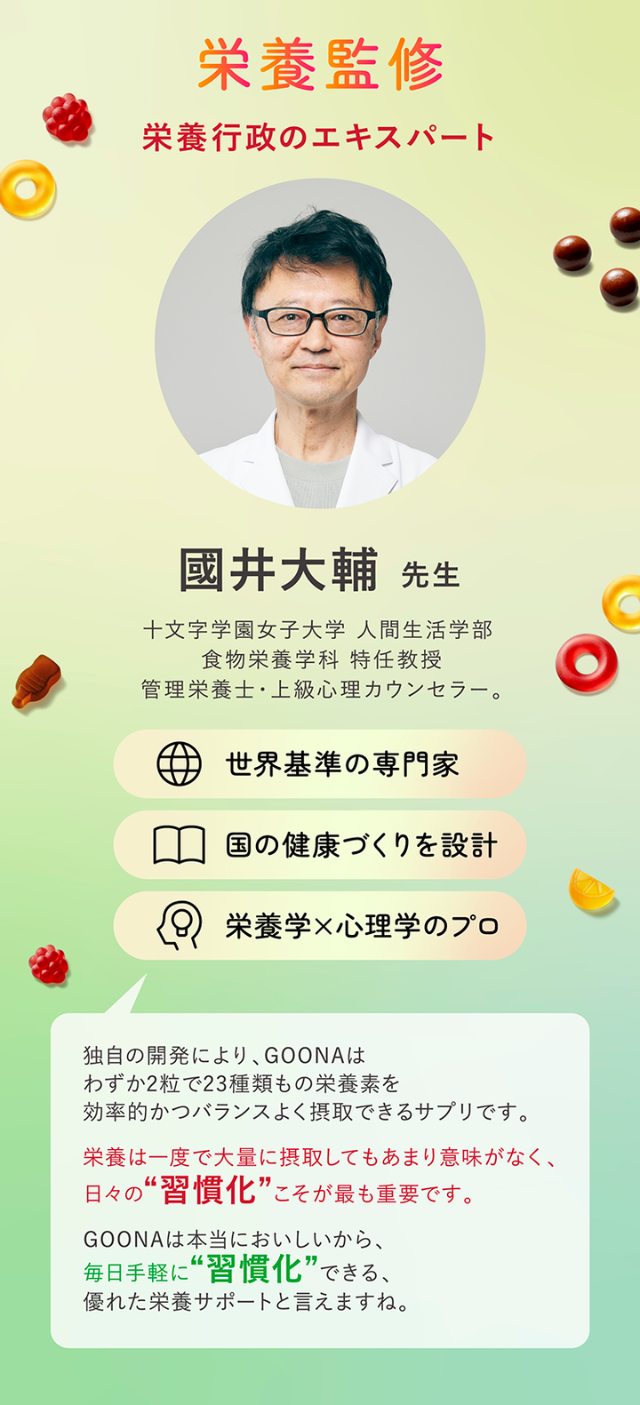 そのためGOONAでは、栄養設計上の理想的なバランスとともに、「習慣として定着させやすい」ことを重要な価値として位置づけ、1日2粒という量を導き出しました。ぜひ毎日の健康習慣として続けていただけますと幸いです。