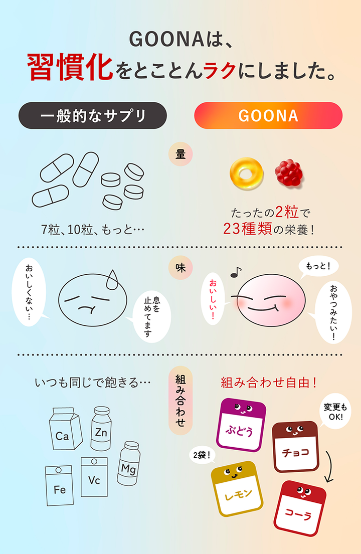 GOONAの完全グミサプリⓇ・完全チョコサプリⓇは、たった2粒で23種類の栄養素をまとめて摂れるよう設計されています。独自のユーザー調査によると、1日に摂取する粒数が2粒より多すぎても、逆に少なすぎても、毎日の習慣として続けにくくなるという結果が出ています。