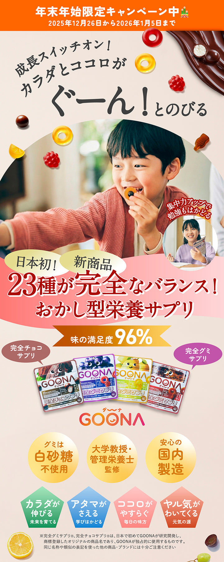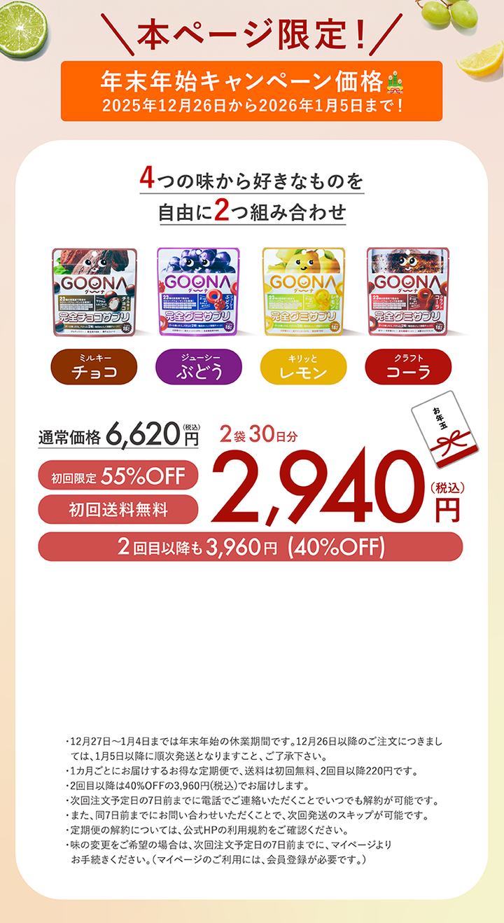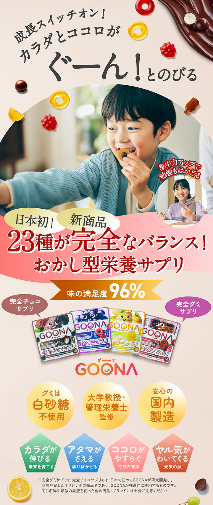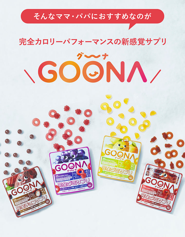 「完全カロリーパフォーマンスⓇ」「完全グミサプリⓇ」「完全チョコサプリⓇ」は、GOONAが独自に開発した、日本で唯一の独占的な登録商標です。類似品には十分ご注意ください。